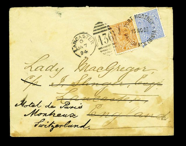 1231 c imagePort Moresby/British New Guinea unframed c.d.s., extremely fine and choice strike tying Queensland 1890-92 1p Orange red and 2p Gray blue on 1893 (November 15) cover to England, redirected to Montreux, Switzerland, via Thursday Island, the stamps additionally tied by very fine Lancaster "436" duplex as departure datestamp upon redirection, showing arrival c.d.s. on reverse, the cover is stained at bottom, not affecting stamps which remain very fresh, an unusual usage and a very fine example of the rare application of the c.d.s. to cancel the stamps; a truly outstanding exhibition cover. (Image) Est. 750-1,000