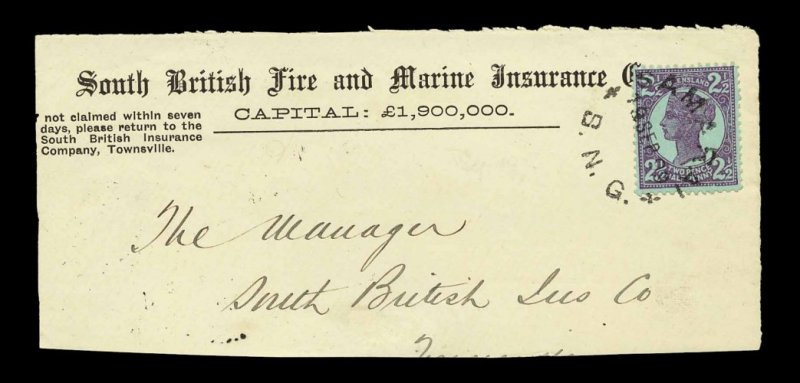 1233 O imageSamarai/B.N.G. unframed c.d.s., very fine strike tying Queensland 1897 2 1/2p Violet on blue on 1899 (Sept. 19) large piece headed "South British Fire and Marine Insurance Co.", extremely fine and fresh. (Image) Est. 150-200