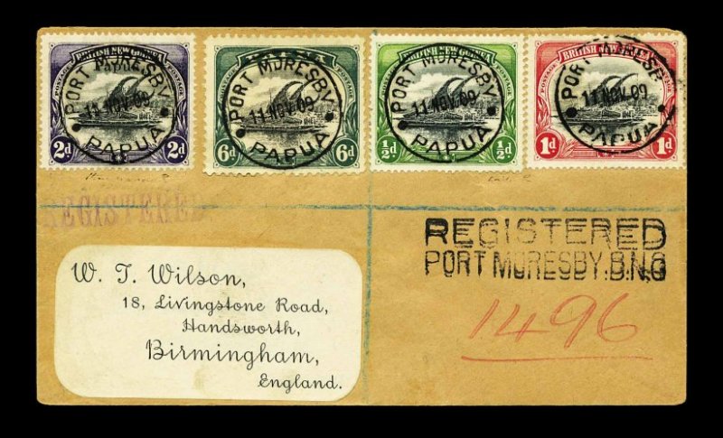 1234 c 1,2,21,39 image#1, 2, 21, 39, 1901 1/2p, 1p, 1907 2p with "Papua" overprint in small type and 1909 6p, all cancelled by choice socked-on-the-nose "Port Moresby/11 Nov 09/Papua" c.d.s. pmks. on registered "Wilson" cover to England, unframed "Registered/Port Moresby, B.N.G." h.s. adjacent, the 6p has a faint crease, a very fine and handsome mixed issue franking. (Image) Est. 100-150