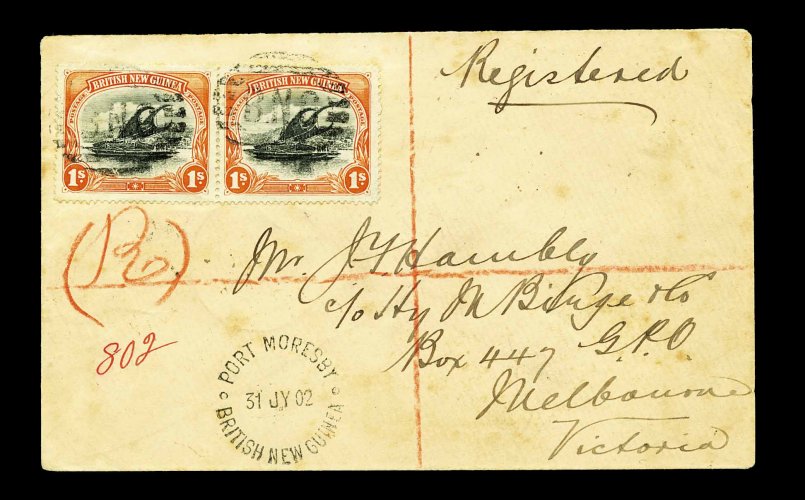 1235 c 7 image#7, 1901 1/- Orange and black, splendid horizontal pair, well centered with bright colors, tied by a "BNG" eight bar obliterator to registered cover, addressed to Melbourne, Victoria via Cooktown and Brisbane, "Port Moresby/British New Guinea" unframed origin c.d.s. adjacent, very fine; a rare franking and outstanding registered usage. (Image) Est. 500-750