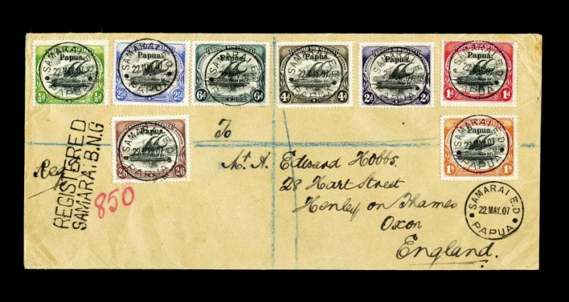 1236 O 11-18 image#11-18, 1906 1/2p to 2/6p, with "Papua." overprint in large type cplt., the set of eight each cancelled (the 2 1/2p is tied) by a gorgeous socked-on-the-nose "Samarai E.D/22 May 07/Papua" c.d.s. on registered front to England, unframed "Registered/Samarai B.N.G." h.s. adjacent, the 1/2p and 1p with minor wrinkling, a colorful philatelic franking. (Image) Est. 150-200