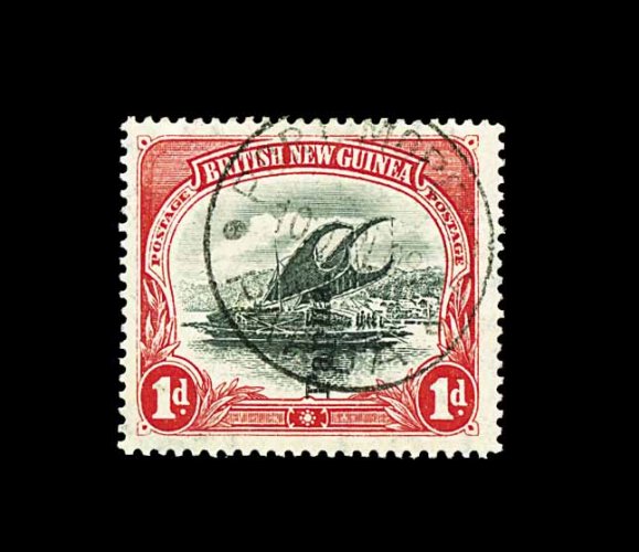 1237 O 20a image#20a, 1907 1p Carmine and black, with "Papua." overprint reading upwards in small type, very fresh, cancelled by Port Moresby c.d.s., a very fine and rare variety (S.G. #39a; £1,200). (Image) 1,150.00