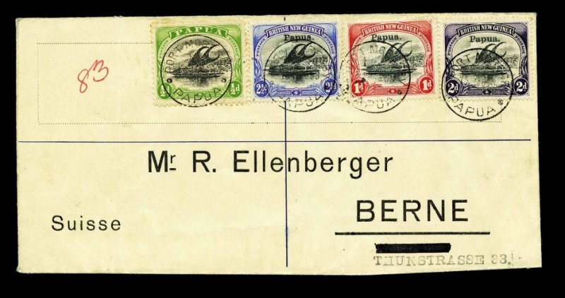 1238 c 20,21,22,41 image#20, 21, 22, 41, 1907 1p, 2p, 2 1/2p with "Papua" overprint in small type and 1907 1/2p, tied by multiple strikes of a "Port Moresby/15 Jan 08/Papua" c.d.s. to registered cover, addressed to Switzerland via Thursday Island and Brisbane, very fine; a colorful mixed issue franking. (Image) Est. 100-150