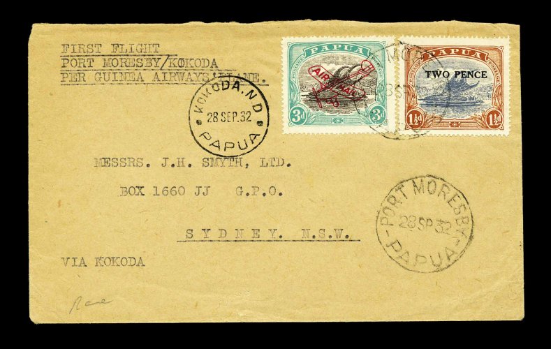 1239 c imageAAMC #10, September 28, 1932 Port Moresby to Kokoda first flight and return covers, the first is combination franked with a 1931 2p on 1 1/2p (#88) and a 1930 3p air post (#C2), each tied by a Port Moresby c.d.s. to cover addressed to Sydney, N.S.W., the second is the return flight franked with a similar air post in combination with a Lakatoi 2p Red violet and violet brown (#63) and appropriately cancelled, fine-very fine; the first flight carried 159 covers, while the return carried 107. (Image) Est. 100-150