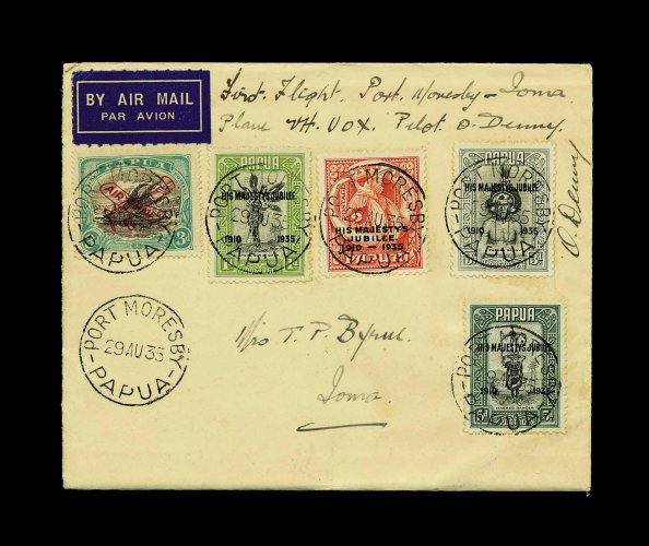 1240 c imageAAMC #17, August 29, 1935 Port Moresby to Ioma first flight and return covers, each bearing the 1935 Silver Jubilee set (#114-17) and a 1930 3p air post (#C2), appropriately cancelled and with arrivals, both signed by the pilot O. Denny, fine-very fine; only 95 and 54 pieces of mail carried respectively. (Image) Est. 100-150