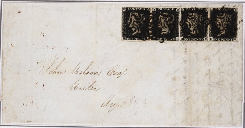 111 c imageHC-HF intense black (S.G. Spec. AS40) horizontal strip of four with good to large margins and just clear at foot of BD, tied to 1841 (18 Mar.) entire (refolded at left to improve appearance) from Glasgow to Ayr (18.3), boldly cancelled by Maltese Crosses in black, ironed out vertical filing crease passes through HD, otherwise very fine and a distinctive usage; 1998 RPS certificate. (Image) Est. £3,000-4,000