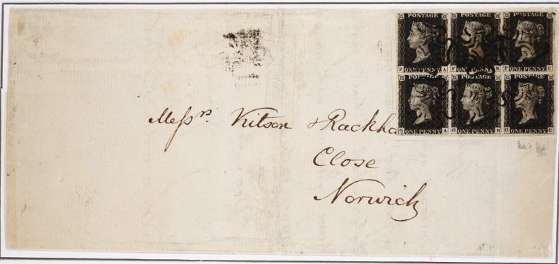 112 c imageFA-GC black (S.G. Spec. AS41) block of six (3 x 2), large margins on three sides, two stamps touched at top, on 1841 (21 Apr.) entire from Holt to Norwich (22.4), nicely cancelled by Maltese Crosses in black, a light vertical filing fold passes through the central row of stamps, a piece bearing the block has at one time been neatly cut out from the cover and precisely rejoined with hinges, an appealing six times rate franking of particular rarity with a block of six; 1986 Holcombe certificate. (Image) Est. £6,000-8,000