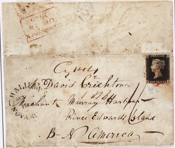 113 c imageEH black (S.G. Spec. AS41), mostly with good to large margins, a few slight surface abrasions, tied to 1840 (18 Oct.) entire letter (light soiling) from Kilmarnock to Prince Edward Island, cancelled by Maltese Cross in red, showing "Halifax / Nova Scotia" double-ring transit d.s. (14.11) adjacent, with framed origin d.s. in red on reverse, various manuscript rate markings "1/-" for trans-Atlantic letter rate, "Cy 1n4 / 2 / 1n6" representing the total due in currency including the inland colonial postage; an unusual and fantastic destination - for British North America as a whole there are only four covers recorded bearing Penny Blacks (two of which are in this collection); 1992 BPA certificate. (Image) Est. £8,000-10,000