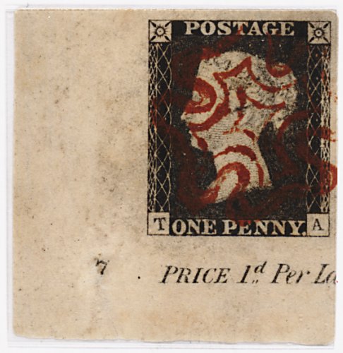 116 O imageTA black (S.G. Spec. AS44), a spectacular example from the lower left corner of the sheet showing plate number "7" and inscription "PRICE 1d. Per La", large to enormous margins all round and bold central Maltese Cross cancellation in red, diagonal crease in margin at lower left outside the plate number which has caused some splitting, while the stamp has some slight ageing and been pressed, these are of little consequence considering its unique status as the only such recorded plate number item from Plate 7; ex-Shaida. (Image) Est. £10,000-15,000