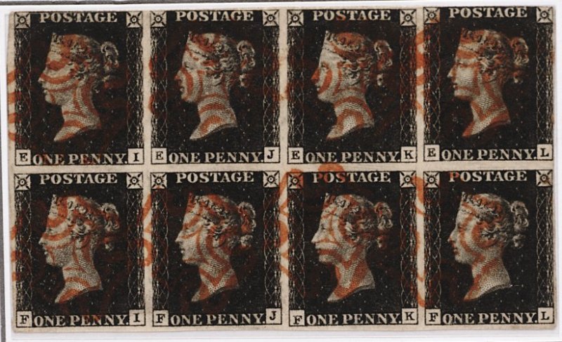 119 Obl imageEI-FL black (S.G. Spec. AS44) block of eight (4 x 2), bright colour and sharp impression, large to clear margins nearly all round except EL just touched at top right corner, FK has slight thinning at foot, neatly cancelled by Maltese Crosses in red, very fine and desirable block; ex-Francis and "Tes". (Image) Est. £2,500-3,000