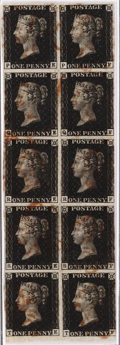 120 Obl PE-TF black (S.G. Spec. AS44, b), a spectacular block of ten (2 x 5) from the foot of the sheet, striking impression displaying all the fine details of the engraving, good to large margins on three sides, two stamps touched at right, lightly cancelled in red, staining slightly reduced and light horizontal creasing, nevertheless a rare and outstanding used multiple block; 1996 BPA certificate; ex-"Daisy". (Image) Est. £2,500-3,000