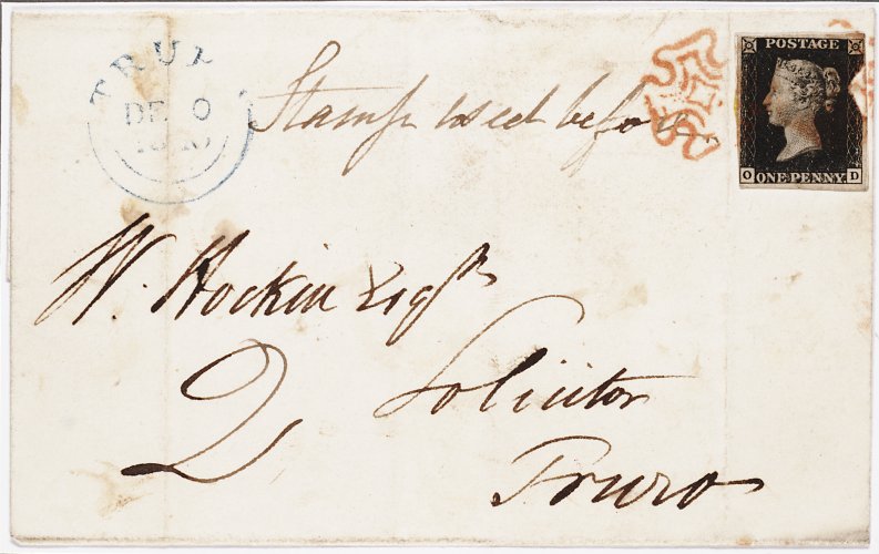 121 c imageOD black (S.G. Spec. AS44) on fragment of the letter from which it was originally cut and with triangular section of the stamp neatly cut out where there was presumably the cancellation, applied with sealing wax on 1840 (Dec.) entire to Truro, tied by two strikes of Maltese Cross in red and showing "Truro" double-ring d.s. in blue adjacent, this clever attempt to defraud the post was detected by the officials, the cover endorsed "Stamp used before" and rated "2" for the double fine; a remarkable example of one of the few surviving instances of one of the attempts to reuse stamps, which was one of the ongoing fears of the post office, hence the reason for the numerous cancellation trials so well documented in this collection; 1990 RPS certificate. (Image) Est. £4,000-5,000