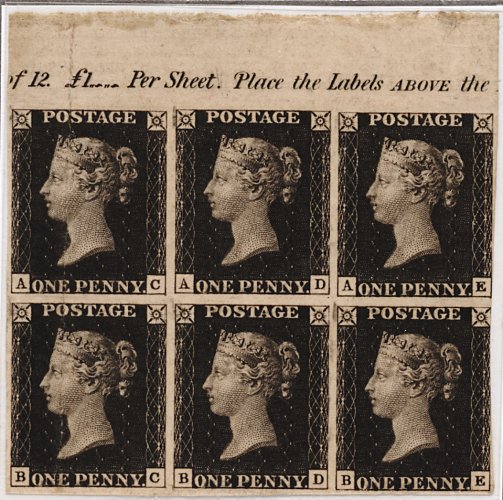 123 ogbl imageAC-BE (S.G. Spec. AS46), a wonderful mint block of six from the top of the sheet showing inscription "of 12. £ 1.. Per Sheet. Place the Labels ABOVE the", with full original gum, good colour and nice clear impression yielding all the fine details of engraving, large margins on three sides, AE very close but just clear and BE touched, creasing through first vertical row, overall in extremely fine condition and highly desirable, since blocks from this plate are especially rare; ex-Shaida. (Image) Est. £10,000-12,000