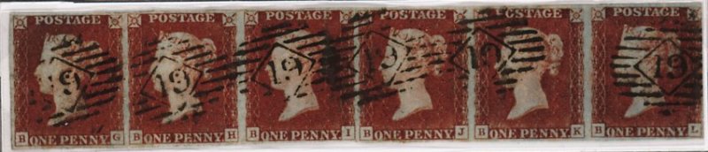 128 O imageBG-BL red-brown (S.G. Spec. AS47) horizontal strip of six, with good to large margins on three sides, BL touched at right, cancelled by London numeral "19", a couple of thin spots, otherwise fine and a rare multiple with the 1844 type cancellation; 1994 BPA certificate. (Image) Est. £350-400