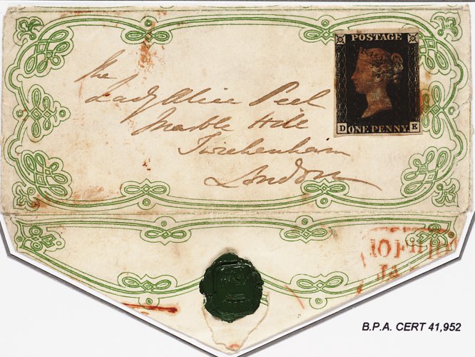129 c imageDE black (S.G. Spec. AS46) with large to clear margins, tied to prim 1841 (19 Jan.) green ladies envelope (matching wax seal of Lord Melbourne on reverse), from Douglas to The Lady Alice Peel (daughter of Sir Robert Peel, former Prime Minister from 1834 to 1835) in Twickenham (21.1), cancelled by Maltese Cross in red, origin and arrival d.s. on reverse, a very pretty cover; 1994 BPA certificate. (Image) Est. £2,000-3,000
