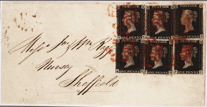 130 c imageNK, OH, OL, PC, PH, QH black (S.G. Spec. AS46), six singles all tied to neat 1840 (c. 12 Dec.) entire from London to Sheffield, cancelled by Maltese Crosses in red, stamps have varying margins and OH surface faults, nevertheless a highly attractive six pence rate franking; clear 1996 RPS certificate; ex-"Daisy". (Image) Est. £500-600