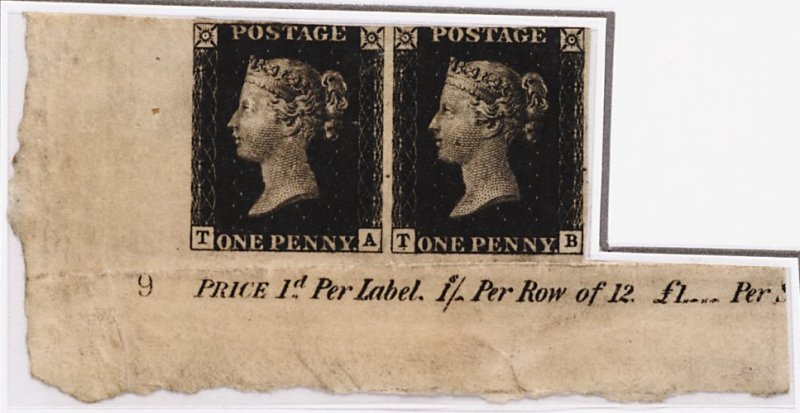 131 og imageTA-TB black (S.G. Spec. AS56), the unique pair from the lower left corner of the sheet showing plate number "9" and inscription "PRICE 1d. Per Label. 1/- Per Row of 12. £ 1.. Per S", deep rich colour, mint with much original gum, touched or just cut into at top and small crease there causing partial splitting, also horizontal crease at foot between stamp and sheet margin; a great Penny Black rarity, being one of the most important pieces extant from Plate 9; ex-Shaida. (Image) Est. £10,000-12,000