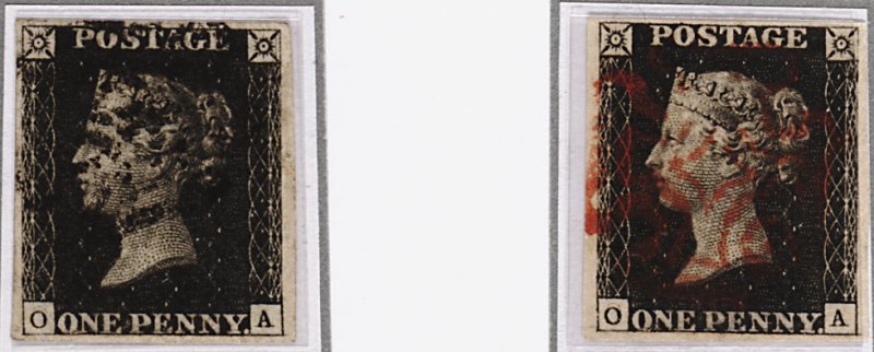 134 O imageOA black (S.G. Spec. AS56c), two examples each showing double letter "O" in "OA", cancelled in red and black respectively, nearly very fine. (Image) Est. £100-120
