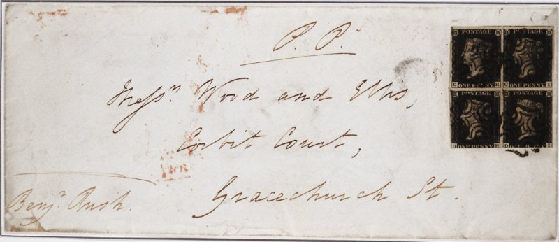 135 c imageCH-DI black (S.G. Spec. AS56) block of four, with good to large margins on three sides showing portions of four adjoining stamps, cut into at foot, CI has light diagonal crease, tied to 1841 (21 Jan.) envelope to London, cancelled by Maltese Crosses in black; a very rare multiple on cover, particularly from this plate; 1988 BPA certificate. (Image) Est. £1,500-2,000