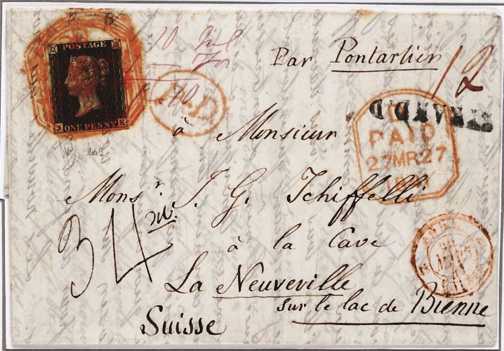 136 c imageJK black (S.G. Spec. AS56), with good to large margins on 1841 (27 Mar.) mourning entire letter from Somerset House, London to La Neuveville, Switzerland (1.4), spectacularly cancelled by several overlapping strikes of London "Paid" tombstone d.s. in red, with another very fine strike adjacent, showing matching oval "P.D.", straight-line "Strand D" h.s. in black, "Angl. / Calais" c.d.s. (29.3) in red adjacent, and "Delle" c.d.s. (31.3) and "Neuveville" double-ring arrival d.s. on reverse, rated "1/10" (10d.= British share and 1/-= foreign share for postage), "12" (decimes), and "34" on arrival; irrefutably the finest cover extant sent abroad bearing a Penny Black, and the only recorded usage of a Penny Black on cover to Switzerland; a peerless postal history gem imbued with character and an incomparable exhibition item of the highest magnitude; 1989 BPA certificate, as well as a 1991 Holcombe certificate. (Image) Est. £25,000-30,000