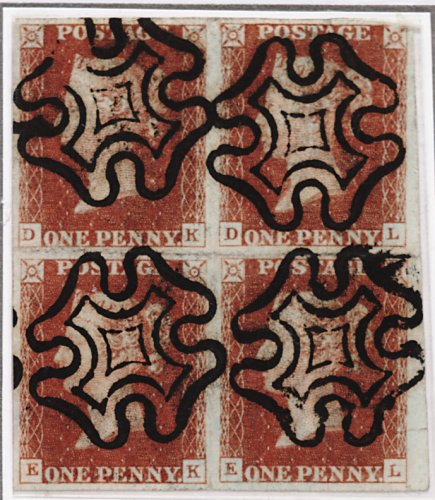 138 Obl imageDK-EL red-brown (S.G. Spec. AS57) block of four from the right of the sheet, vivid colour, large to huge margins and with choice crisp Maltese Cross cancellations, some ironed out creasing most noticeable in the margin between the two horizontal rows of stamps, a stunning block of great visual appeal; ex-"Daisy". (Image) Est. £250-300