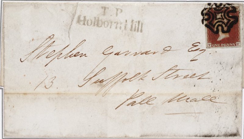 139 c imageTF red-brown (S.G. Spec. AS57), large margins on three sides, just cut into at top, tied to 1849 (19 Feb.) entire (tear at top) used locally in London, boldly cancelled by Maltese Cross in black, showing unframed "T.P. / Holborn Hill" h.s. adjacent, and framed d.s. (19.2.41) in red on reverse; believed to be the earliest recorded date of use of Plate 9 in red; 2000 Brandon certificate. (Image) Est. £1,500-2,000