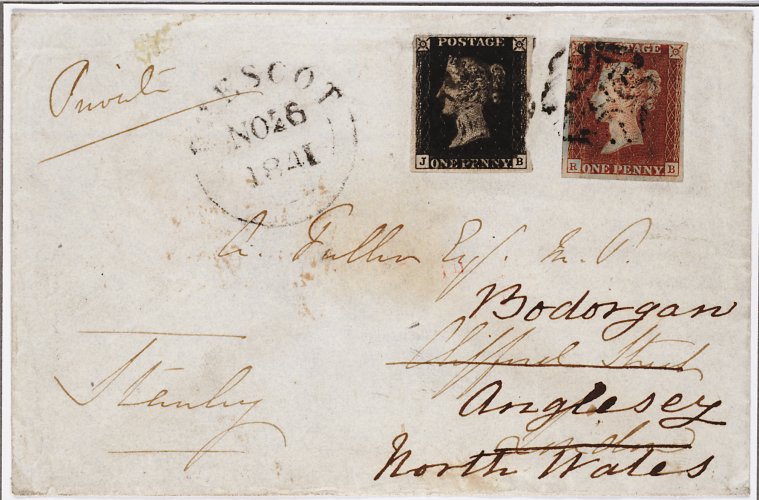 140 c imageRB red-brown (S.G. Spec. AS57), with large even margins, tied to 1841 (26 Nov.) envelope from Prescot to London (27.11), cancelled by Maltese Cross in black and redirected to Bangor (28.11), bearing 1d. black Plate 8 JB (S.G. Spec. AS46) cancelled by Maltese Cross also in black, the stamps have small faults, nevertheless a rare and appealing usage of both colour printings of black plates on one cover; 1996 BPA certificate. (Image) Est. £2,500-3,000