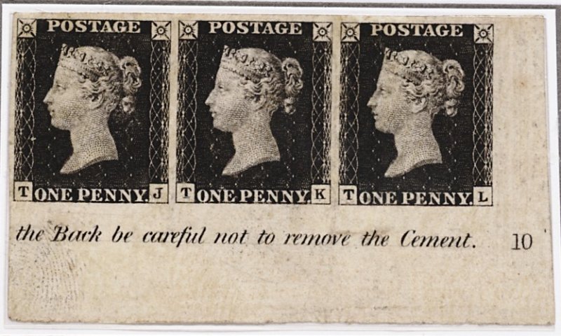 143 ng imageTJ-TL grey-black (S.G. Spec. AS67), the impeccable unused strip of three from the lower right corner of the sheet showing plate number "10" and inscription "the Back be careful not to remove the Cement.", uncharacteristically fine impression for this plate, large to enormous margins all round, some light barely perceptible pressed creases which are inconsequential to this wonderful and famous corner plate number piece which ranks among one of the most important line engraved items extant; ex-Seymour and Shaida. (Image) Est. £25,000-30,000
