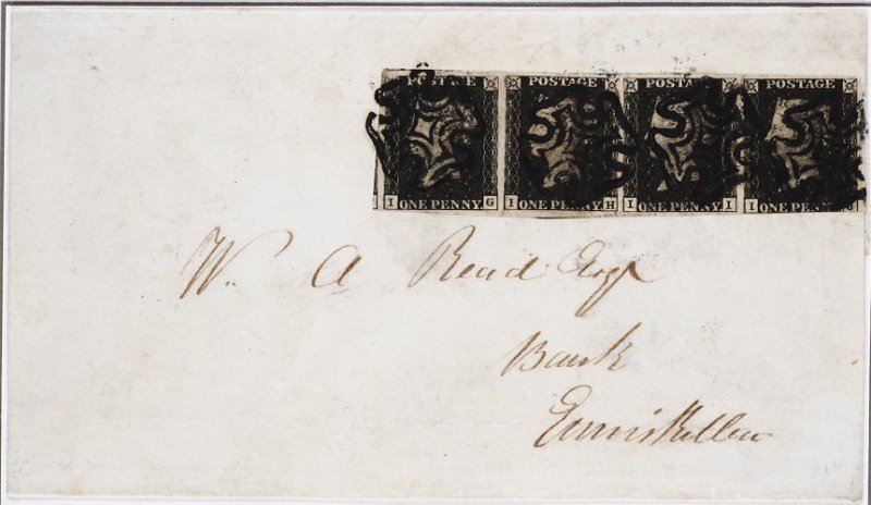147 c imageIG-IJ black (S.G. Spec. AS66vc) horizontal strip of four, large margins nearly all round showing portions of four adjoining stamps, IJ touched at foot, tied to 1841 (12 Mar.) entire from Lisnaskea to Enniskillen (12.3), cancelled by Maltese Crosses in deep blue, with origin and arrival double-ring d.s. on reverse; a rare franking cancelled by an especially rare and desirable coloured cancellation; 1976 BPA certificate; ex-Shaida. (Image) Est. £7,000-8,000