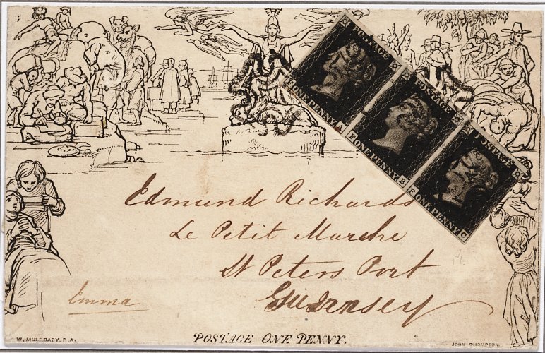 148 c imageFA-FC black (S.G. Spec. AS66) horizontal strip of three with large to just clear margins, small tear at right, neatly tied to 1841 (26 June) Mulready 1d. letter sheet (stereo obscured, light horizontal crease at foot) from Waterford to Guernsey, cancelled by Maltese Crosses in black and showing double-ring origin d.s. on reverse, the stamps have at one time been skillfully lifted and replaced; a lovely uprated Mulready from Ireland to the Channel Islands; 1996 BPA certificate; ex-Seymour, Knox, and "Daisy". (Image) Est. £6,000-8,000