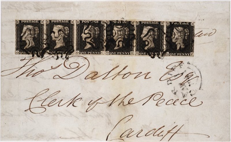 149 c imageOA-OF grey-black (S.G. Spec. AS67) horizontal strip of six, margins all round except just touched at right, tied to 1841 (31 Mar.) large part entire from Swansea to Cardiff (1.4), cancelled by Maltese Crosses in black, two stamps crossed by vertical filing crease (accompanying certificate states lifted and reaffixed, which we find inaccurate since the strip still possesses much of its original gum, the creases have not been pressed, and it is in exactly the same state as when offered in the first Seymour sale), a fine and appealing franking; evidently the largest multiple from this plate known on cover; 2000 RPS certificate; ex-Seymour and "Daisy". (Image) Est. £1,200-1,500