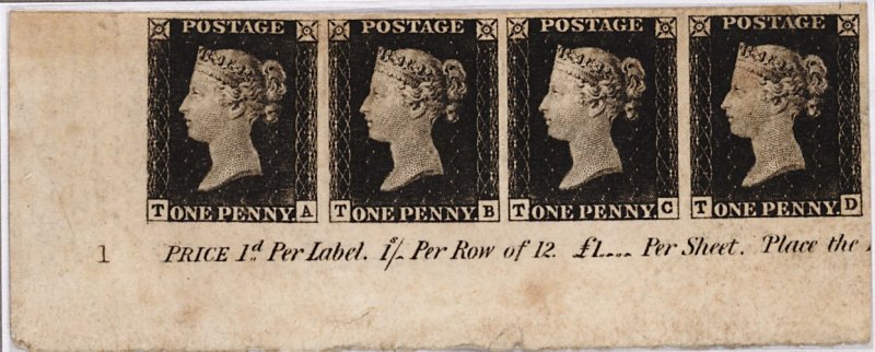 33 og imageTA-TD black (S.G. Spec. AS2), the magnificent unused horizontal strip of four from the lower left corner of the sheet showing plate number "1" and part inscription "Price 1d. Per Label. 1/- per Row of 12. £ 1.. Per Sheet. Place the", deep rich colour, only just beginning to show signs of plate wear above value tablets, exceptionally large margins all round, small part original gum, TA has small thin spot and TD has crease at top right resulting in some splitting as well as thin, overall in a fine state of conservation for this important and famous plate number piece; ex-Seymour. (Image) Est. £20,000-25,000