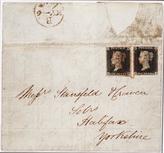 37 c imageEK and and HF grey-black (S.G. Spec. AS2ta) on 1840 (6 May) letter sheet (clearly dated inside) from London to Halifax, cancelled by Maltese Cross in red and showing "B / May-6 / 1840" origin c.d.s. on reverse, EK with large to clear margins and HF has large even margins but small split at top from cover tear (also splitting at joins there), the despatch c.d.s. while distinctly dated on the official day of issue of the Penny Black has been slightly improved for appearance sake, visually a pleasing and rare first day cover, and one of only two double rate covers with multiple frankings recorded from this plate; 1998 RPS certificate. (Image) Est. £15,000-20,000