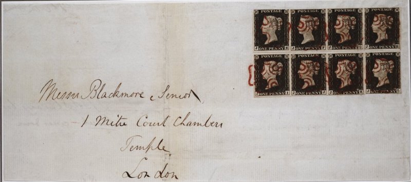 38 c imageJE-JH and JI-JL grey-black (S.G. Spec. AS2tf) two horizontal strips of four, both with mainly large to clear margins but just touched in a few places at top, nicely tied to 1840 (16 May) front and part back of large letter sheet (some central reinforcement) from Chichester to London, cancelled by Maltese Crosses in red, showing departure and arrival c.d.s. on reverse, the stamps have at one time been lifted and replaced; a spectacular eight pence rate cover for letters up to four ounces used during the first eleven days; 1998 RPS certificate; ex-Francis. (Image) Est. £2,500-3,000