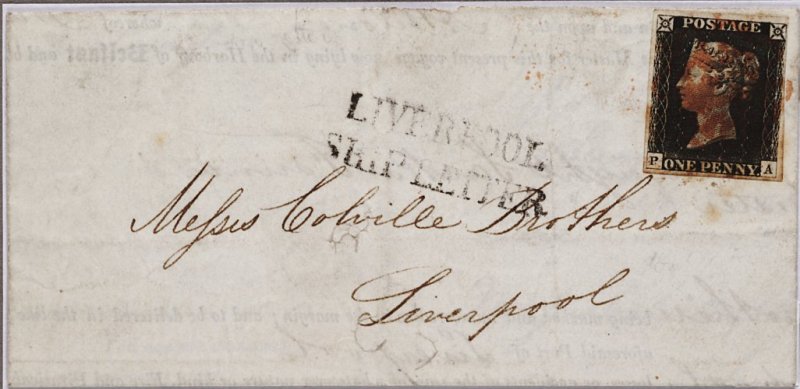 39 c imagePA intense black (S.G. Spec. AS1), good to large margins, tied to 1840 (25 Sept.) shipping notice (two filing spike holes on front panel) from Belfast to Liverpool, cancelled by Maltese Cross in red and showing unframed "Liverpool / Ship Letter" adjacent, a fine and interesting usage from a private steamer which took advantage of the extended uniform penny postage for letters conveyed from one port to another within Britain. (Image) Est. £600-800