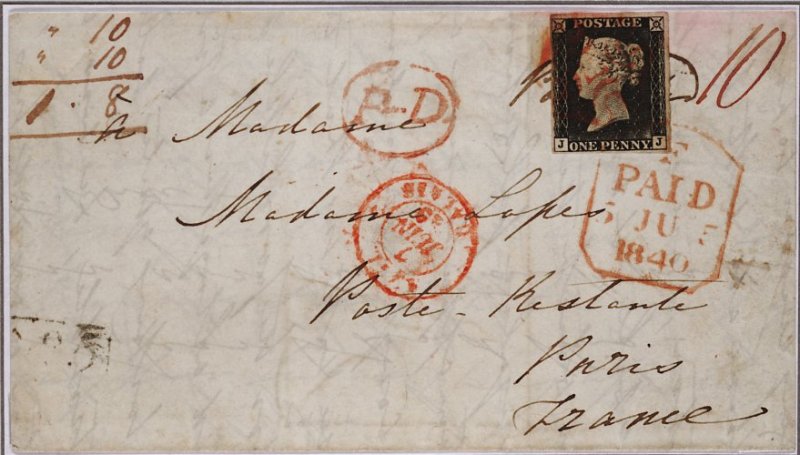 40 c imageJJ black (S.G. Spec. AS1), ample to large margins, sealed tear at top left resulting from corner crease, nicely tied to 1840 large part entire (no side panels) from Plymouth to Paris, cancelled by Maltese Cross in red and additionally tied by London "F / Paid / 5 Ju 5 /1840" d.s. also in red, showing matching oval "P.D." h.s. and "Angl. / Calais" c.d.s. (7.6) adjacent, with "Plymouth / Py Post" d.s. also in red on reverse, rated 1/8 (10d. for cross-Channel ship rate and 10d. for internal postage); one of the earliest usages of a Penny Black to France, and of the utmost appeal; 1998 RPS certificate; ex-Levett (Image) Est. £3,000-4,000