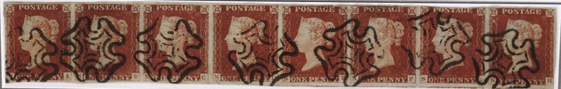71 O imageNA-NH red-brown (S.G. Spec. AS18), a reconstructed horizontal strip of eight rejoined from the original strips of five and three, good to large margins nearly all round (except for NF which has defects), showing portions of four adjoining stamps, neatly cancelled by Maltese Crosses in black, overall very fine and a noteworthy strip which is probably the largest reconstruction from this printing. (Image) Est. £600-800
