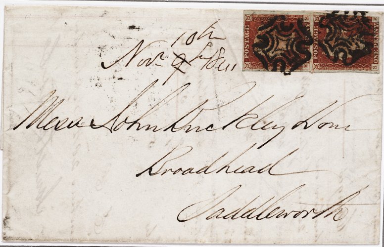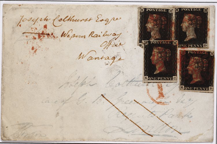 80 c imageNC and ND intense black (S.G. Spec. AS19a) overlapping singles, NC has truncated lower left corner, on 1840 (12 Nov.) envelope from Glasgow to London (14.11), redirected to Wantage with Plate 8 EB (top right corner touched) and EC black (S.G. Spec. AS46) cancelled by Maltese Crosses in red and additionally tied by circular "L" (Letter Carrier's Office) h.s. also in red, a fine and very scarce redirected double rate cover; 1997 Brandon certificate. (Image) Est. £2,000-2,500