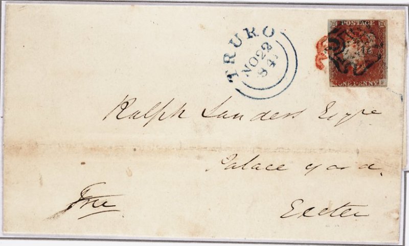 73 c imageMF red-brown (S.G. Spec. AS18), ample to large margins, negligible corner crease at lower left, tied to 1841 (22 Nov.) entire letter (central filing crease) from Truro to Exeter (23.11), unusually cancelled by Maltese Crosses in blue and red, a most striking and scarce combination of coloured cancels; 1947 RPS certificate. (Image) Est. £400-500