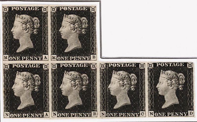 77 ogbl imageMA-MB/NA-ND grey-black (S.G. Spec. AS21), a stunning mint "L"-shaped block of six, outstanding clear impression and colour showing plate wear, good to large margins except MB and ND barely touched in one place, virtually full original gum that is unusually clean, NC has a light vertical crease, nevertheless very fine and fresh; an exceptionally attractive and rare mint multiple; ex-Adams and "Tes". (Image) Est. £10,000-12,000