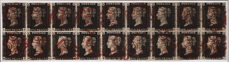 79 Obl imageLB-MJ black (S.G. Spec. AS20), the incredible block of eighteen, vivid colour, mostly with margins but touched in places and some creasing, neat Maltese Cross cancellations, overall in a very fine state of conservation for what has been recorded as the largest used multiple of the Penny Black in existence; one of the most important classic multiples in philately and an astounding exhibition item; ex-Seymour (from which LK/MK were one time cut in order to make the block free of repairs). (Image) Est. £80,000-100,000
