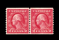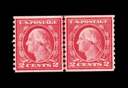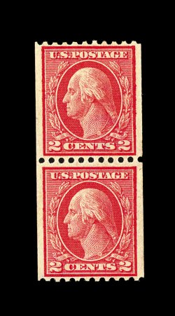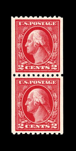 246 nh 444 image#444, 2c Carmine flat plate coil, perf. 10 vert., "post office" fresh guide line pair, possessing radiant color in an intense shade, razor-sharp impression as well, wonderfully well centered, o.g., n.h., extremely fine; exceptional quality for this scarce and difficult line pair; 1996 PF certificate. (Image) 525.00