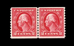 244 nh 442 image#442, 2c Carmine flat plate coil, perf. 10 horiz., superb mint pair, precisely centered within extravagantly large margins, strikingly intense color and impression, immaculate o.g., n.h., extremely fine; a gem coil pair for the perfectionist. (Image) 45.00
