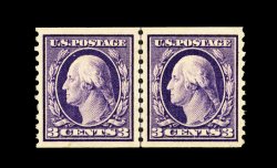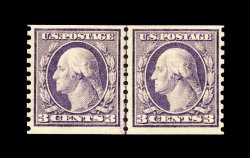 247 og 445 image#445, 3c Violet flat plate coil, perf. 10 vert., guide line pair, perfectly centered within extravagantly large margins, deep luxuriant color and a well incised impression on bright paper, o.g., extremely fine; a gem example of this very scarce line pair; 1996 PSE certificate. (Image) 1,300.00