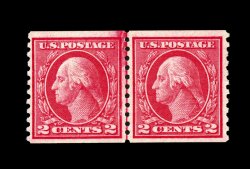 253 og 453 image#453, 2c Carmine rose rotary coil, Ty. I, perf. 10 vert., joint line pair, extraordinarily well centered for this scarce line pair, gloriously rich color, o.g., lightly hinged, extremely fine. (Image) 725.00