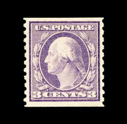 256 nh 456 image#456, 3c Violet rotary coil, Ty. I, perf. 10 vert., an extraordinary quality mint single of this scarce coil, being in a condition that would be hard to improve upon, possessing mathematically precise centering within very large margins, gorgeous fresh color and a crisp detailed impression on bright paper, pristine o.g., n.h., extremely fine; the finest certified never hinged single of this we have ever offered; 2000 PF certificate. (Image) 430.00