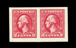283 nh 534B image#534B, 2c Carmine offset imperforate, Ty. VII, a spectacularly margined horizontal pair of this rare 20th century stamp, boasting absolutely huge margins all around (even a bit of the framelines appear at bottom from the adjoining stamps), brilliantly fresh, radiant color and impression on immaculately white paper, o.g., never hinged, there are a couple of bends/wrinkles endemic to the wartime offset issues which are not mentioned on the accompanying certificate, otherwise extremely fine; easily the largest margined pair of this rarity we have ever offered; clear 1981 PF certificate. (Image) 7,500.00