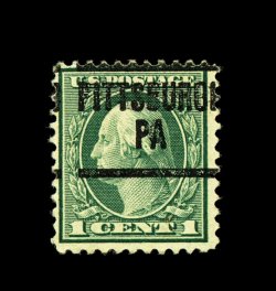 285 O 544 image#544, 1c Green sheet waste, perf. 11, an especially handsome used example of this rare and notoriously difficult stamp, being quite well centered within uncharacteristically large margins, strong rich color, crisp "Pittsburgh/Pa." precancel, a very fine and choice example of the One Cent Green rotary press sheet waste issue; 1997 PF certificate. (Image) for fine 3,250.00