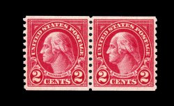 287 nh 599A image#599A, 2c Carmine coil, Ty. II, perf. 10 vert., an incredibly choice mint pair, being in a condition that would be a challenge to duplicate, possessing mathematically perfect centering within large margins, gorgeous intense and "fiery" color, immaculate o.g., n.h., extremely fine; a gem coil pair in every regard; 1998 PF certificate. (Image) 410.00