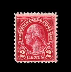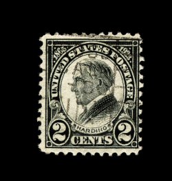 288 O 613 image#613, 2c Harding, rotary press perforated 11, quite well centered for this, particularly when compared to other existing examples, wide even margins on three sides, right perforations close but clear, intensely rich color and an unusually clean impression on bright paper, very light and unobtrusive slogan machine postmark, completely devoid of the faults which affect many of the known copies, tiny natural paper inclusion visible only on reverse, very fine for this. The Two Cent Harding rotary press perforated 11 stamp is one of the most sought-after rarities in United States philately. There are 39 confirmed singles and two pairs known - all of which are used. Nearly two-thirds of the existing population are sound, however a great many of these are found quite poorly centered, often with the perforations cutting the design. The McKinney copy is among the better centered examples available and one of the most eye appealing in terms of its overall quality. A highly desirable example of this important rarity. Accompanied by a 1986 PF certificate. (Image) for fine 35,000.00